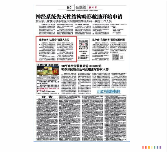據(jù)《新晚報》2019年8月8日第B01版報道,27歲的患者小卓(化名)發(fā)現(xiàn)頸部有腫物,當?shù)蒯t(yī)院診斷為“甲狀腺占位”,需進行手術(shù)治療。該患者來到哈爾濱醫(yī)科大學附屬第四醫(yī)院就診點名希望使用達芬奇機器人進行甲狀腺切除手術(shù)。在主任陳之顯及其團隊一個多小時的努力下,手術(shù)順利完成。這是我國首例“達芬奇”Xi機器人甲狀腺切除術(shù),這臺手術(shù)的順利完成,標志著哈醫(yī)大四院機器人微創(chuàng)甲狀腺手術(shù)在全國處于先進行列。