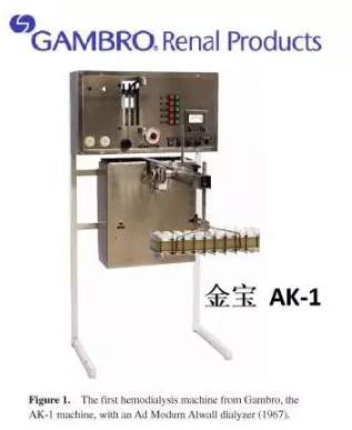 動靜脈shunt的發(fā)明,自體動靜脈內(nèi)瘺成形術(shù)的成功,給慢性腎衰患者的治療帶來了新的福音,讓透析變?yōu)榭赡?。透析設(shè)備所蘊含的巨大商業(yè)價值也立刻被嗅覺敏銳的商人運用起來,下圖為金寶和百特各自推出的第一代透析機,如今金寶已被百特并購。