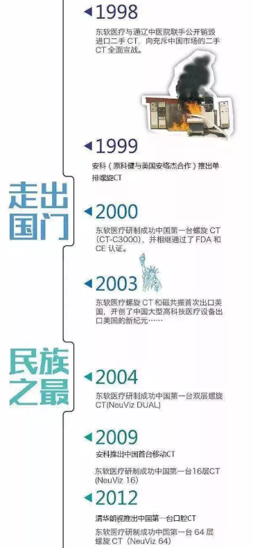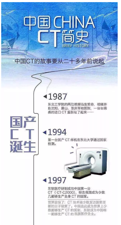 1998年,東軟醫(yī)療正式成立,以CT為代表的國產(chǎn)醫(yī)療設(shè)備向產(chǎn)業(yè)化、規(guī)模化發(fā)展。至此,國產(chǎn)CT成功完成產(chǎn)業(yè)化轉(zhuǎn)換并投放市場,開始與國際大牌廠商在CT市場短兵相接,這也標(biāo)志著中國成為繼美國、日本、德國、荷蘭之后又一個(gè)能夠成功研制CT的國家!