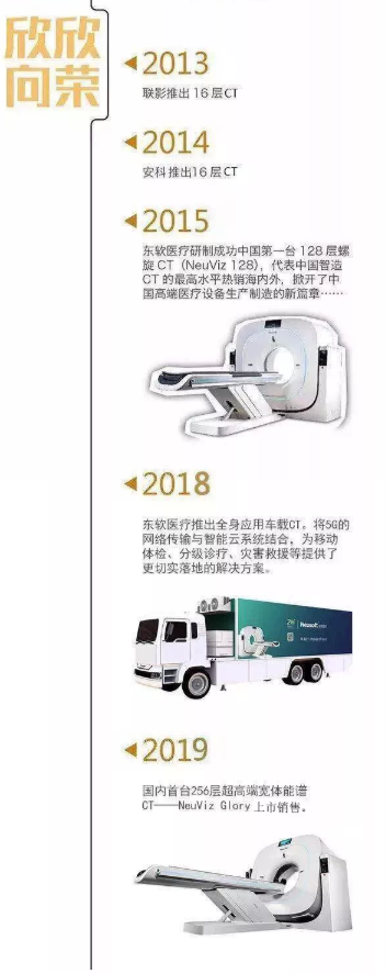 2009年,東軟醫(yī)療成功研制出中國首臺核心技術(shù)自主知識產(chǎn)權(quán)的16層CT;2012年,中國第一臺擁有自主知識產(chǎn)權(quán)的64層螺旋CT-NeuViz 64也相繼問世,其中的球管,探測器,高壓發(fā)生器,數(shù)據(jù)采集系統(tǒng)等核心部件的技術(shù)和產(chǎn)業(yè)化水平已達(dá)國際級水準(zhǔn);2015年,東軟醫(yī)療又推出中國第一臺擁有自主知識產(chǎn)權(quán)的128層螺旋CT,扎實(shí)的從低端走到高端。