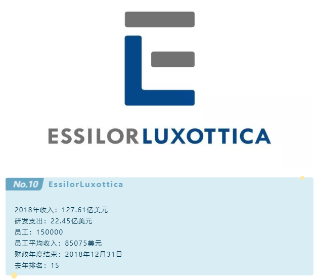 EssilorLuxottica于去年10月與法國鏡片專家Essilor和意大利眼鏡制造商Luxottica合并后成立,以540億歐元的價(jià)格成為全球最大的眼鏡制造商。通過并購從全球醫(yī)療器械企業(yè)第15位一舉躍進(jìn)十強(qiáng)席位。