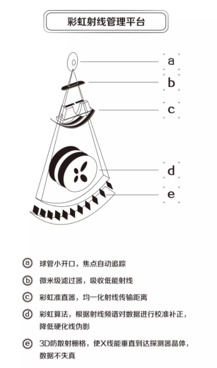 b、動(dòng)態(tài)三維變焦球管---8MHU飛焦點(diǎn)金屬球管,配合全息微晶元探測(cè)器實(shí)現(xiàn)221184有效采樣通道,降低偽影,獲得全息高清數(shù)據(jù)影像。