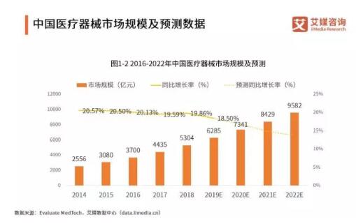 艾媒咨詢數(shù)據(jù)顯示,中國醫(yī)療器械整體市場規(guī)模已由2014年的2556億元增長至2018年的5304億元,年均增速保持在20%左右,營業(yè)收入及凈利潤均保持高速增長態(tài)勢,屬于醫(yī)療器械行業(yè)發(fā)展黃金期,預(yù)計(jì)到2022年中國醫(yī)療器械市場規(guī)模將超過9000億元。