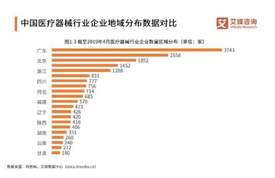 國內(nèi)醫(yī)療器械企業(yè)主要集中在珠三角、長三角以及京津冀環(huán)渤海三個地區(qū),截至2019年4月,全國共有醫(yī)療器械類企業(yè)約1.88萬家,其中以廣東、江蘇和北京為典型省市,擁有醫(yī)療器械企業(yè)數(shù)量分別為3743家、2558家和1852家。