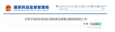 2019年12月19日,國(guó)家藥監(jiān)局發(fā)布消息,近日國(guó)家藥監(jiān)局批準(zhǔn)上海聯(lián)影醫(yī)療科技有限公司研制的創(chuàng)新醫(yī)療器械 “正電子發(fā)射及X射線(xiàn)計(jì)算機(jī)斷層成像掃描系統(tǒng)”。
