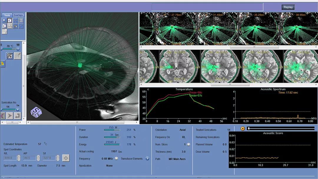 Exablate Neuro 用于對藥物難治性突發(fā)性震顫患者進行單側(cè)丘腦切開術(shù)治療。其超聲波可安全穿過腦顱,聚合后將震顫致病靶點(即丘腦的 VIM 核)加熱融化。