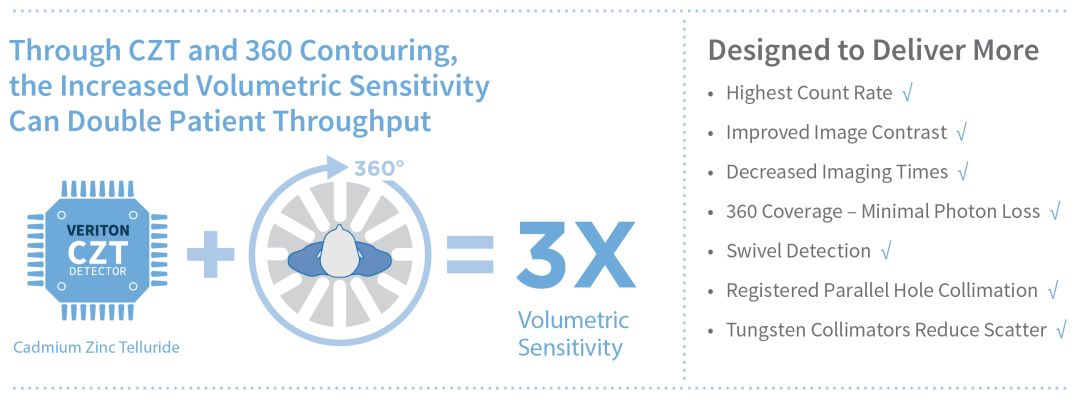 新的VERITON?在設(shè)計(jì)時考慮了三維人體。它使用12個獨(dú)立的探測器臂提供360度覆蓋。通過用檢測器圍繞患者,與傳統(tǒng)的雙頭陣列相比,光子檢測最大化并且圖像質(zhì)量得到增強(qiáng)。