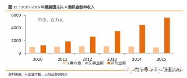 從上圖看出,A企業(yè)的試劑和儀器如果按金額計算,超出10:1,但由于以前裝機(jī)的儀器會產(chǎn)生累計疊加效應(yīng),因此不能單純相比,要根據(jù)儀器保有量測算修正。