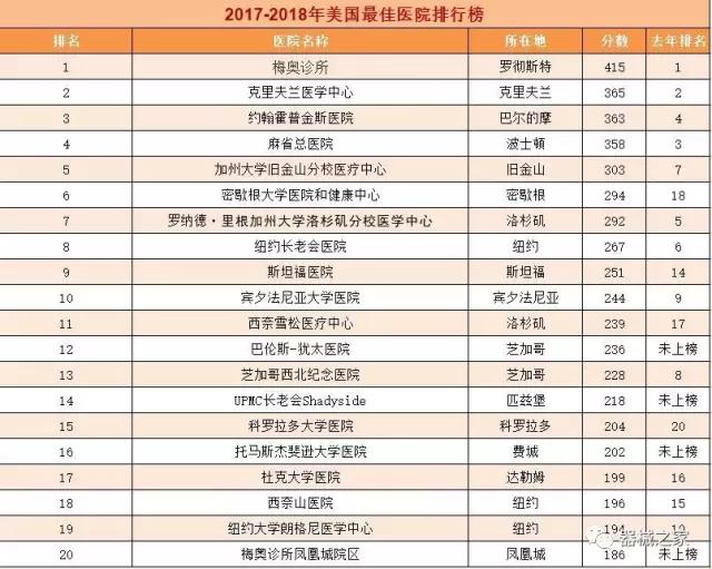 在醫(yī)療界梅奧診所就是傳說中的麥加,世界頂尖的醫(yī)療機(jī)構(gòu)。2017年8月8日,《美國新聞與世界報(bào)道》公布了2017-2018美國最佳醫(yī)院排行榜,梅奧診所以415分的總分再次榮登榜首,并在糖尿病和內(nèi)分泌專科、胃腸科、婦科、腎臟科、神經(jīng)??坪屠夏瓴W(xué)六個(gè)??浦信琶谝?。