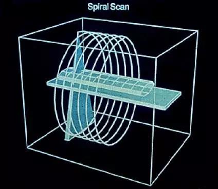 在治療之前,先由KVCT對病人進行斷層掃描,根據(jù)此掃描圖像由治療計劃系統(tǒng)進行逆向治療計劃設(shè)計,即各個角度束流形狀及流強分布設(shè)計;也既計算出在治療環(huán)每一個旋轉(zhuǎn)角度和治療床前進的每一個位置上的多葉準(zhǔn)直器各個葉片的確切位置。然后打開加速器,用MVCT再核準(zhǔn)病灶位置;如有錯位,預(yù)先進行調(diào)節(jié);在治療過程中,治療環(huán)旋轉(zhuǎn)和治療床勻速前進,進行螺旋照射,見圖(2)
