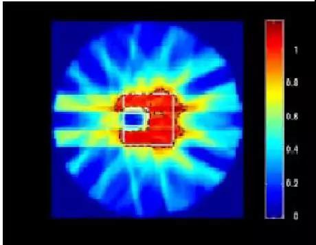 上圖中紅色部分為要高劑量照射的惡性鼻咽瘤,而中間藍(lán)色部分為要保護的脊髓。目前其它的放療設(shè)備就無法治療此類腫瘤了,但是該螺旋斷層放射治療儀就可以施治。