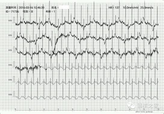 3、關(guān)于抗干擾能力,對(duì)于只有兩個(gè)電極沒(méi)有地線的情況下,對(duì)這個(gè)機(jī)器的要求真的不能太高?;€干擾和不穩(wěn)定是經(jīng)常的,所以需要測(cè)試人配合安靜勿動(dòng)。測(cè)試1描測(cè)的心電圖除了只有一個(gè)導(dǎo)聯(lián)的限制之外,基本可以滿足各項(xiàng)心電圖數(shù)據(jù)的測(cè)量。測(cè)試2和3都是處于深度鎮(zhèn)靜氣管插管的小兒,出現(xiàn)兩個(gè)問(wèn)題:1.小兒腹軟且腹部動(dòng)度較大導(dǎo)致呼吸波干擾明顯,所以建議把左下腹電極片貼到左髂部或左股部外側(cè);2.基線干擾更加明顯,這時(shí)本人手握患兒左下肢后基線干擾消失,對(duì)心電記錄波形沒(méi)有產(chǎn)生明顯影響。